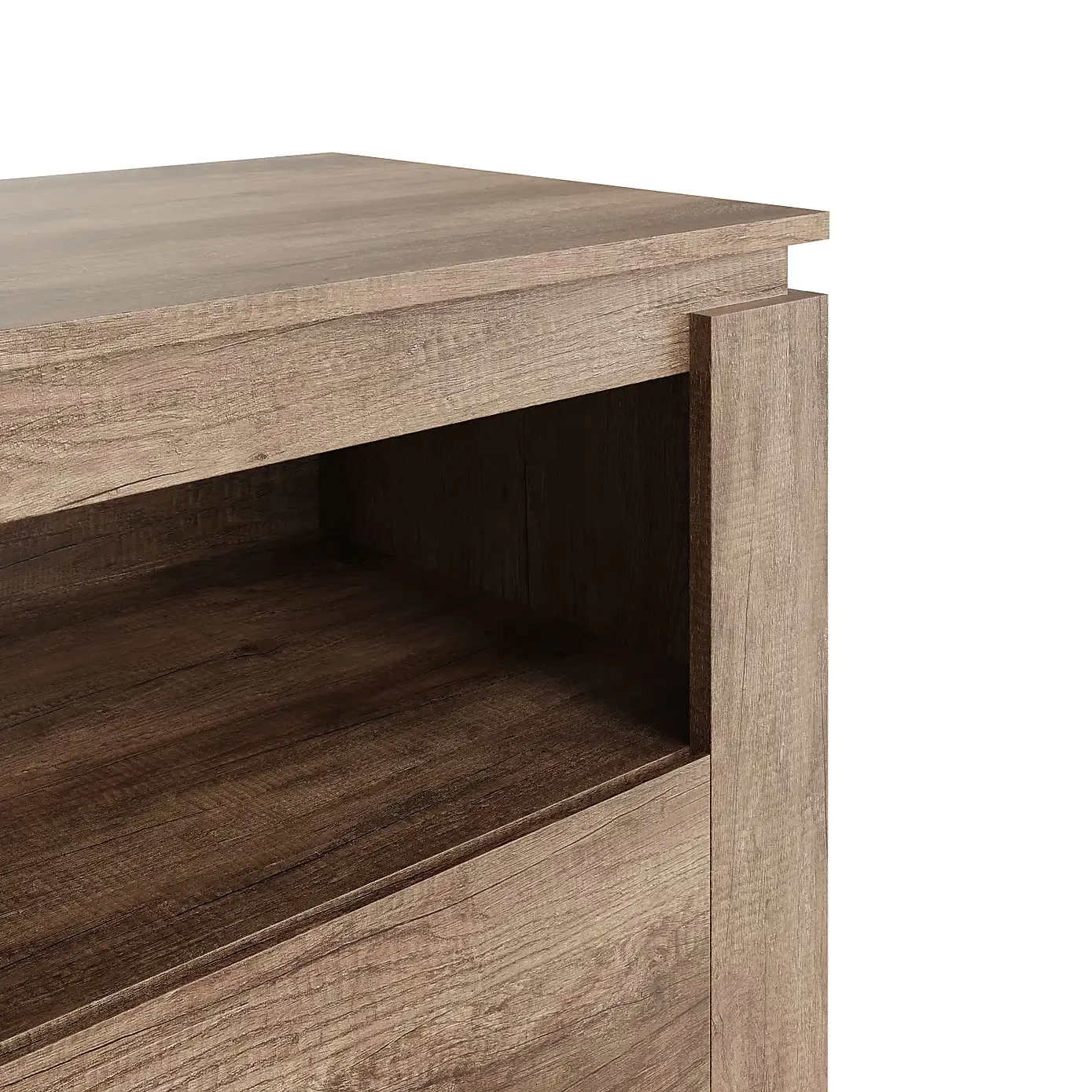 Designed with a space-saving approach, this tv stand features two open shelves perfect for housing TV boxes or consoles, alongside a cupboard for additional storage. The unit’s realistic wood aesthetic and elegant 3D oak effect finish add a sophisticated touch to any living room.
