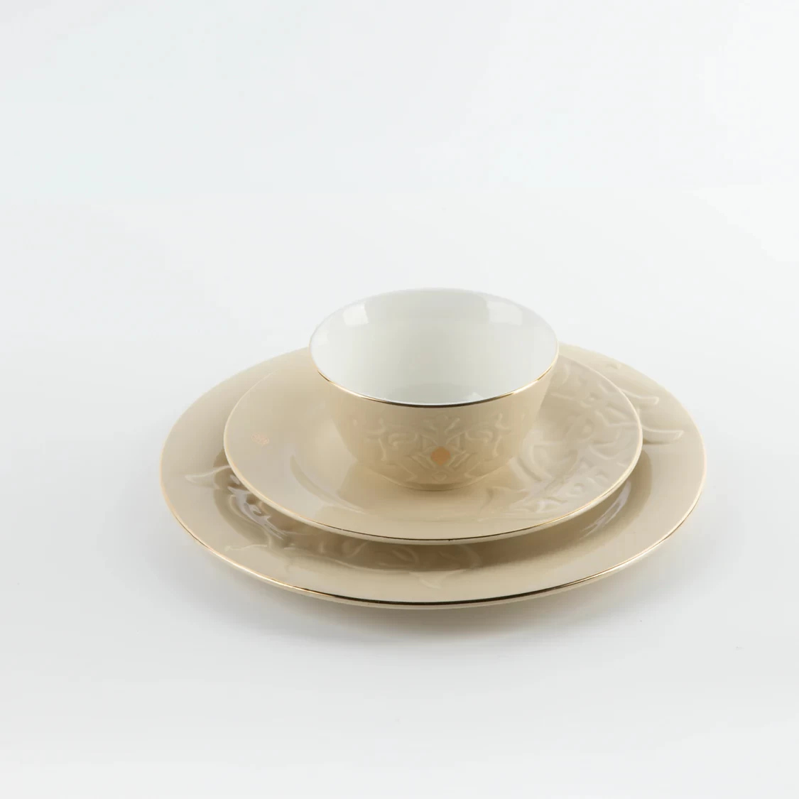 This 18-piece dinner set pairs a soft ivory finish with luxurious gold detailing for a timeless look. It includes dinner plates, side plates, and bowls for a complete dining experience. Crafted from high-quality porcelain, it is both elegant and durable. Perfect for formal dinners or enhancing your everyday table setting. |