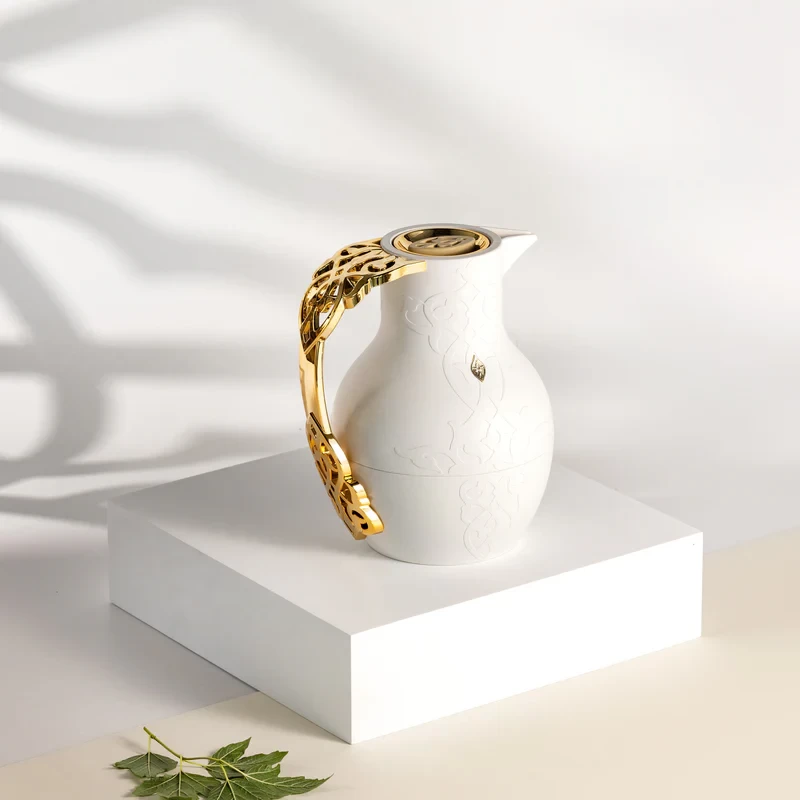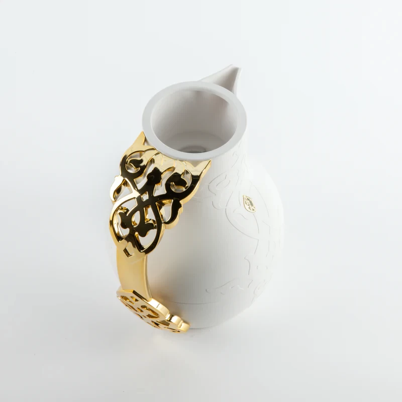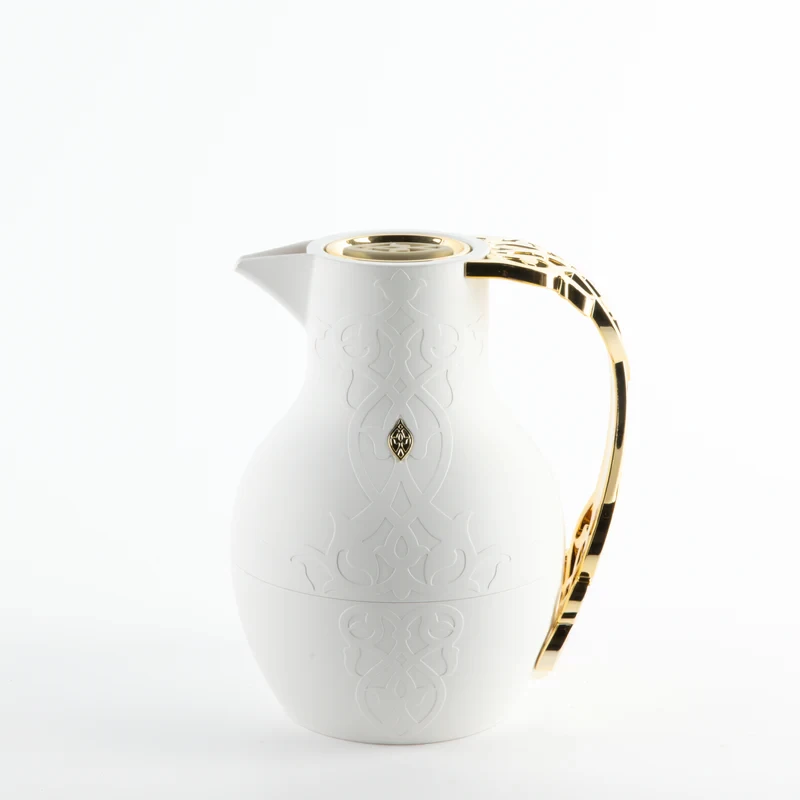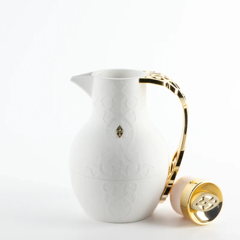 Add a touch of elegance to your serving with this beautiful vacuum flask. The white and gold design creates a classic and luxurious look. Its 1-liter capacity keeps tea or coffee hot for hours. Crafted from premium materials for durability and reliable performance. |