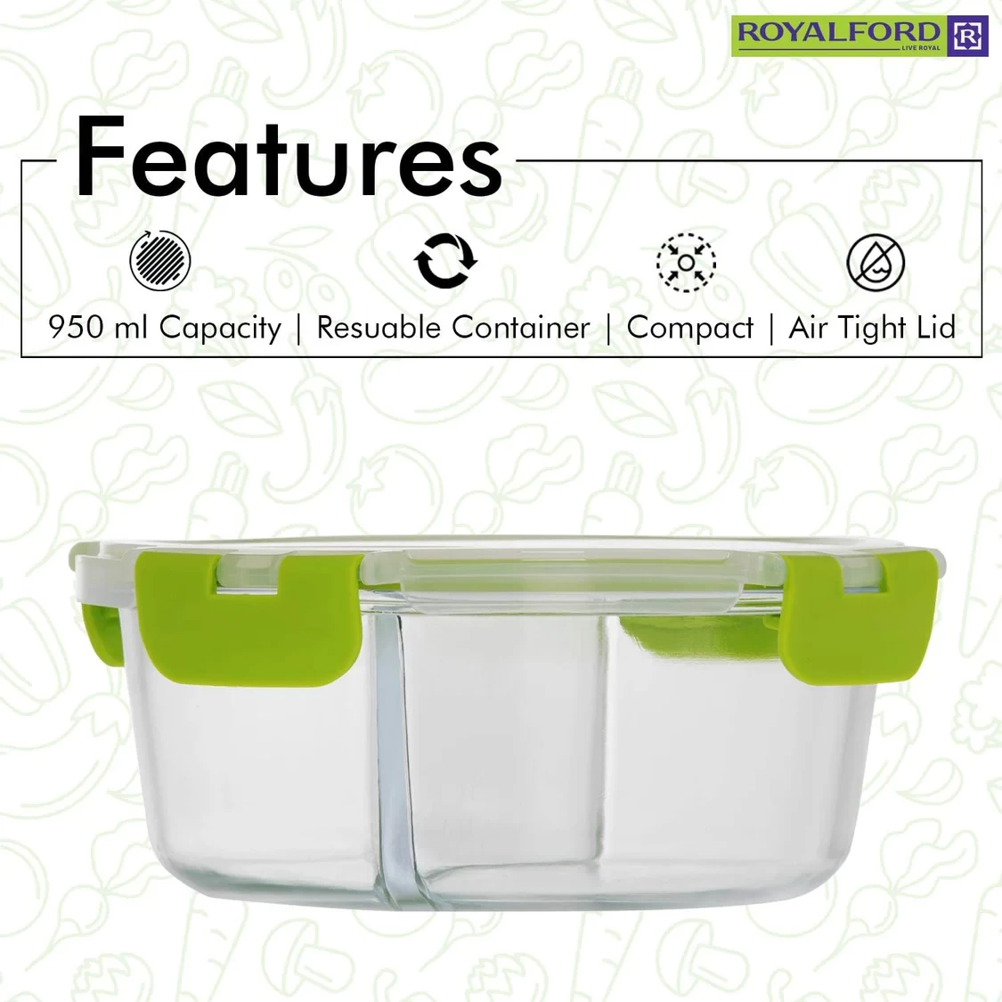The Royalford two-compartment container separates meals neatly in one dish. Made of sturdy borosilicate glass with a tight sealing lid. Ideal for portion control and organized meal prep. Safe for microwave, oven, and dishwasher. |